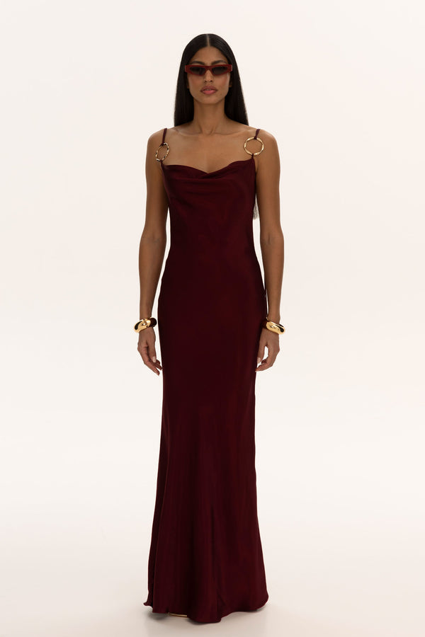 A silhouette that whispers in low light — After Dark is a floor-length slip gown in deep burgundy satin, its liquid surface catching every shadow. The draped neckline falls with quiet ease, held by sculptural gold rings at the shoulders, while the body skims close before flowing into a fluid hem. Minimal yet magnetic, it is a study in seduction refined. This is the dress that doesn’t shout — it lingers, unforgettable.