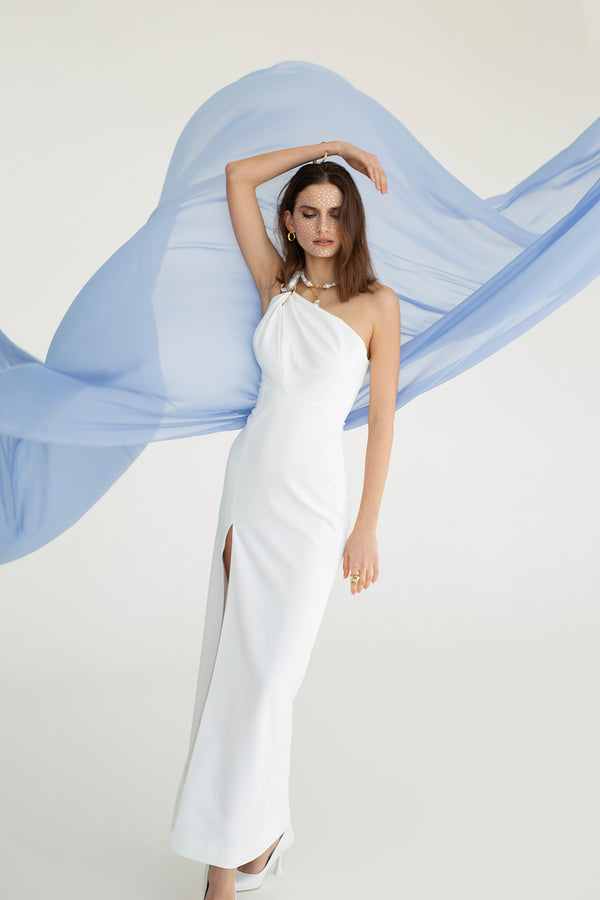 A vision of purity and flow — Amor Eterno captures the essence of timeless grace. Crafted in pristine white, the gown’s asymmetric neckline is adorned with a sculptural knot detail, while its sleek silhouette falls effortlessly into a daring thigh-high slit. It is both restrained and sensual, a modern ode to goddess-like femininity.