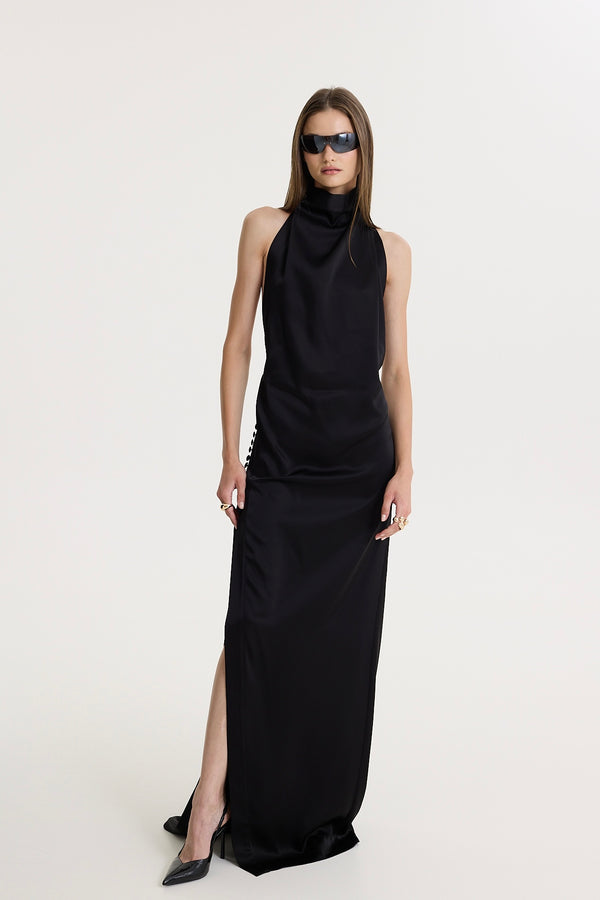 A silhouette that stalks the night like a secret — Black Allure is a floor-length gown cut in liquid satin, its surface as dark as silence. The high halter neckline folds with quiet intent, while the open back bares the skin like a revelation. Side buttons trace the line of the hip, leading into a daring slit that carves shadow into movement. This is the dress that doesn’t chase attention — it commands it, in whispers.