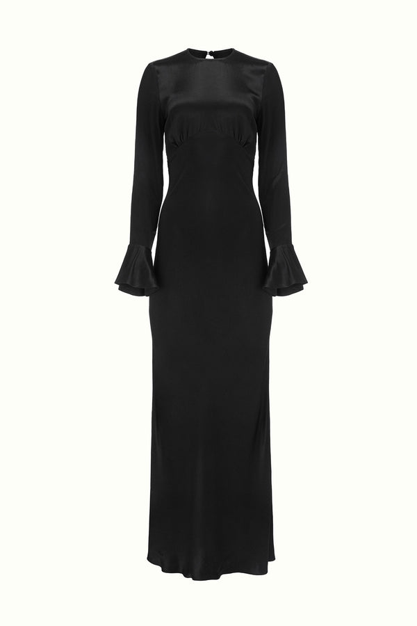A shadow that reveals — Black Diamond Dress is a gown that marries restraint with revelation. From the front, its high neckline and long sleeves speak in quiet authority, the flared cuffs adding a whisper of drama. But turn, and the back opens in a sweeping cut — a contrast as striking as night and flame. Sleek, sculptural, and magnetic, it is elegance designed for the unexpected.