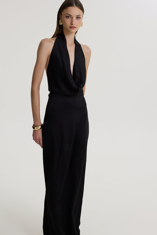 A whisper of seduction, sculpted in silk. Black Honey is a floor-length halter gown that drapes with the softness of nightfall. The plunging cowl neckline reveals just enough, while the sleek cut glides along the silhouette, embracing the body in liquid movement. Every seam is intentional — every glance, inevitable.