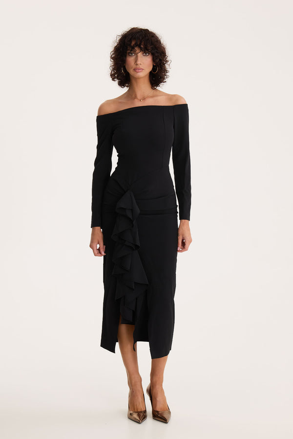 A silhouette of sculpted elegance — Black Passion is a dress that channels timeless refinement through bold, modern lines. The off-the-shoulder neckline frames the collarbones with quiet allure, while long sleeves sharpen its minimal strength. At the waist, draped folds release into a cascading ruffle, a detail that adds movement and drama to its tailored precision. Feminine yet commanding, it is passion shaped in black.