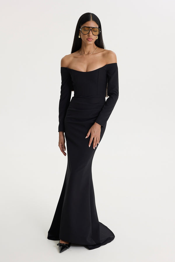 Classic meets contour in Black Poem — a floor-length gown designed with minimalist lines and maximum impact. The off-the-shoulder neckline enhances the décolletage with quiet allure, while long sleeves bring balance and elegance. Subtle draping at the waist flatters the form, leading into a clean, column-like silhouette that flows with ease and confidence.