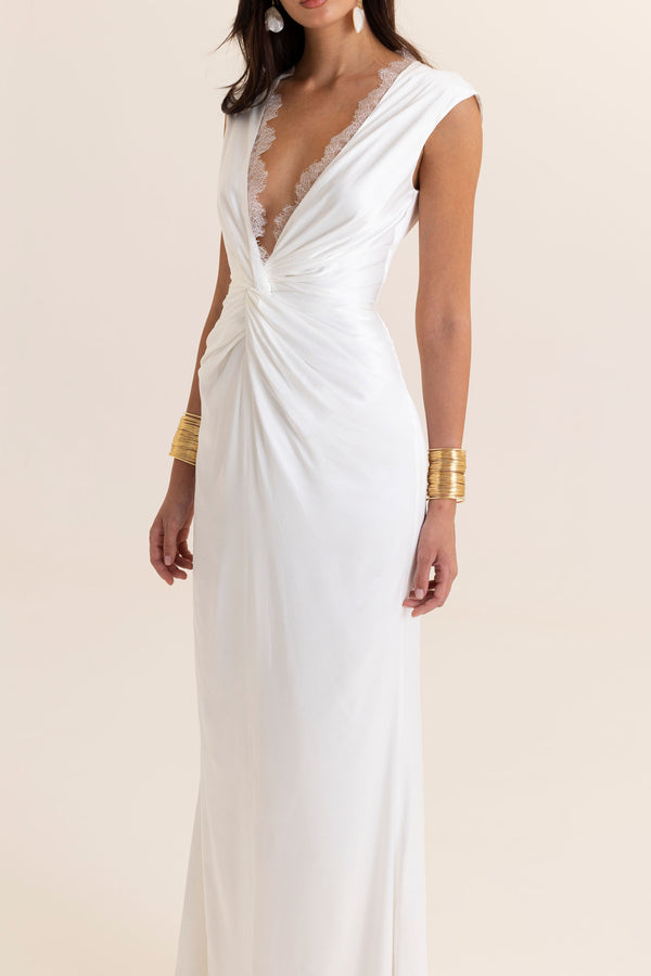 A vow captured in silk — Blanc Elegance is a gown of quiet radiance and sculpted grace. Cut from fluid fabric, it gathers softly at the waist, creating a silhouette both effortless and intentional. The deep V neckline is traced with delicate lace, a whisper of intimacy against the purity of white. Every fold, every line speaks of elegance that feels both timeless and immediate — a moment suspended in fabric.