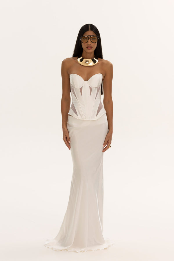 An architectural vision in ivory — Blanco Corset sculpts the body with precision and poetry. Sheer panels frame its boned silhouette, creating an interplay of opacity and light, strength and delicacy. Both sensual armor and timeless adornment, it is designed to turn presence into power.