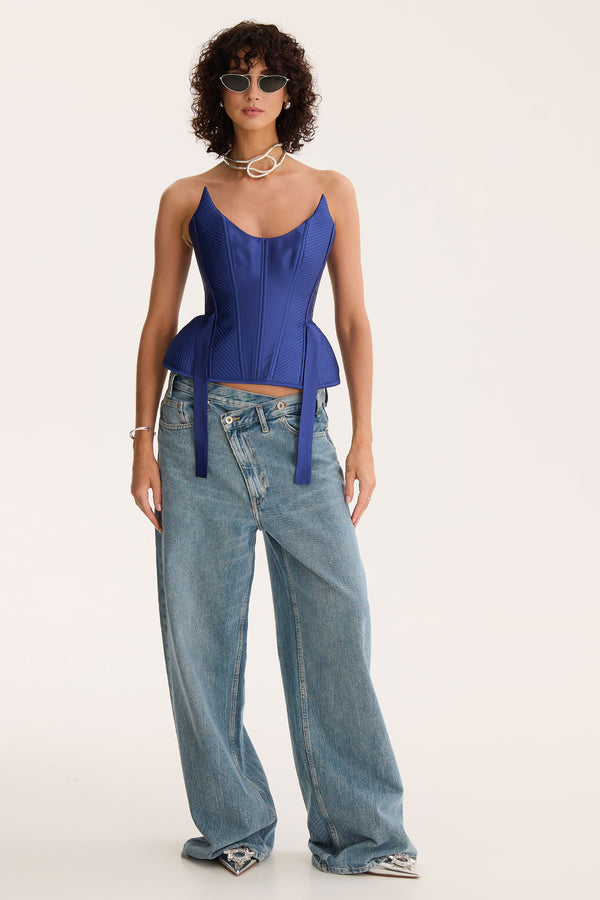 A study in bold femininity, Blue Rabbit is sculpted from lustrous crimson satin that catches the light like a quiet flame. The structured bodice smooths and shapes with precision, while the curved neckline creates a lifted, romantic silhouette. Two elongated ties fall gracefully from the waist, adding a touch of undone allure. Paired with relaxed denim, it becomes the perfect balance of softness and edge.
