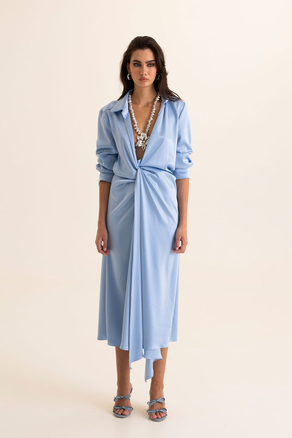 Elegantly following the natural curves of the body, it is cut from silk with an asymmetric hem. A reminder of torrid summer days, Blue Vanilla calls for another round of cocktails.