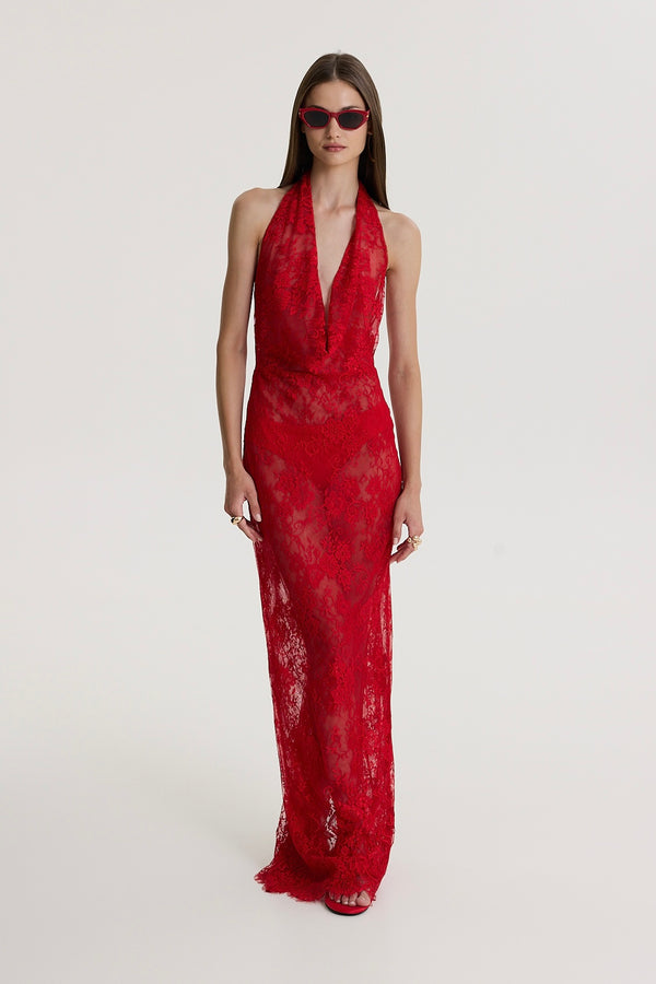 Designed to turn heads and set the tone, Crimson Heat is the ultimate statement in sensual elegance. Crafted from sheer floral lace in a blazing red hue, it features a deep halter neckline and an open back that dares without saying a word. The floor-length silhouette skims the body, while scalloped edges and barely-there coverage create a balance of boldness and sophistication.