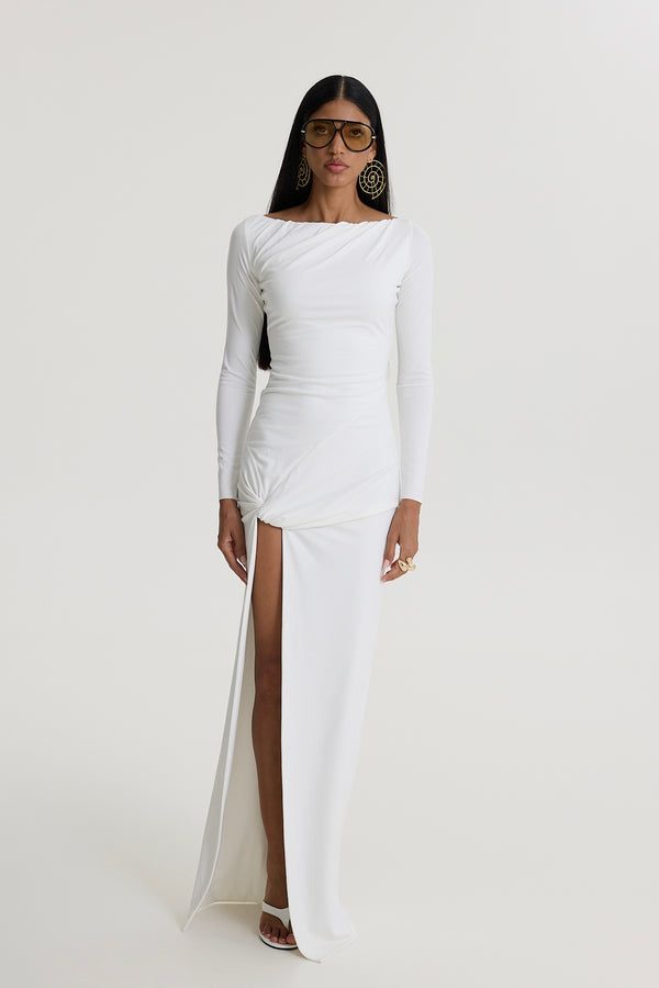 A timeless statement of effortless sophistication, the Flow Dress features a sleek, body-skimming silhouette with delicate draping that flatters every curve. The off-shoulder neckline adds a touch of grace, while the thigh-high slit introduces an element of modern allure. Crafted from a soft, fluid fabric that moves with you, this dress is perfect for evening soirées, destination weddings, or any occasion where understated luxury is key. Finished with long sleeves and a refined ruched detail, it's a versatile staple for the contemporary muse.