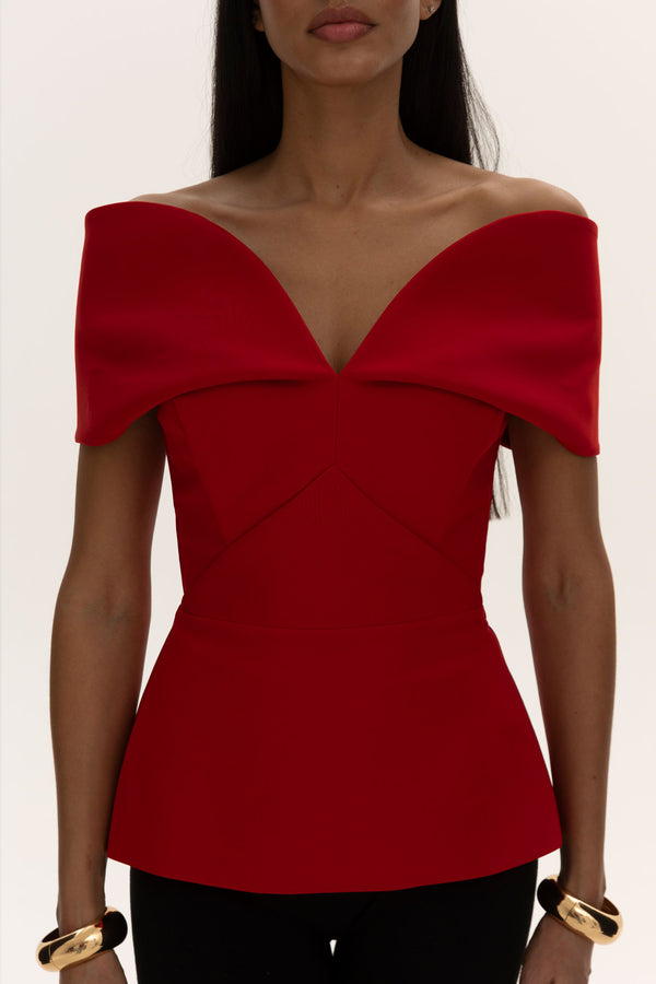 A rose carved in fabric — Heart Top is a top that sculpts structure into romance. Crafted in bold red, its off-shoulder neckline folds like petals in bloom, framing the décolletage with architectural grace. The fitted bodice flows into a subtle peplum flare, striking a balance between power and femininity. More than a top, it is a statement — daring, sculptural, alive.