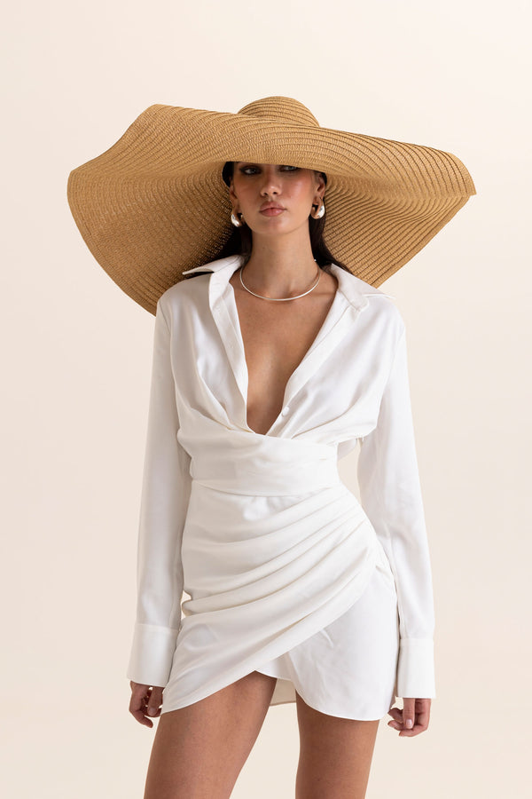 A statement of bold ease — La Bomba is a dress that turns simplicity into seduction. Cut in crisp white, its shirt-inspired top plunges daringly at the neckline, balanced by long sleeves and tailored cuffs. Draped folds at the waist sculpt the silhouette into a wrap-style skirt, creating a shape that is both effortless and provocative. Playful, confident, unforgettable — it is summer distilled into a dress.