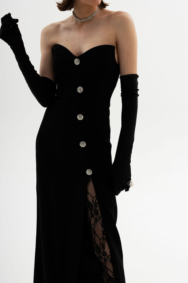 A constellation stitched in midnight —La Furia Negra is a gown that fuses classic glamour with modern seduction. Cut in a sculpted strapless silhouette, it traces the form with quiet precision, while crystal buttons glimmer like stars across the front. A daring slit reveals lace beneath, a secret detail made to intrigue. Finished with opera-length gloves, it becomes a portrait of elegance both timeless and arresting.