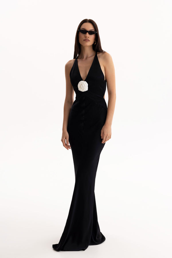 A bloom in the shadows — La Rose Noir is a gown that transforms minimalism into poetry. Cut in fluid black satin, it skims the figure with effortless grace, its plunging neckline framed by clean architectural lines. At the heart, a sculptural white rosette blooms in contrast, a detail that turns simplicity into statement. Timeless yet daring, it is the black gown reimagined with modern romance.
