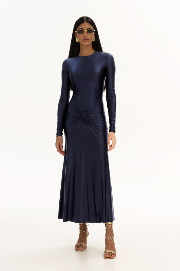 A silhouette that flows like deep water at dusk — Lunar Dress is a long-sleeved gown in lustrous navy satin, cut to elongate and sculpt with quiet precision. The high neckline balances its fluid grace, while the gathered knot detail at the waist draws the eye into a soft ripple, shaping the form with subtle power. Sleek, modern, and serene, it is the embodiment of elegance distilled.