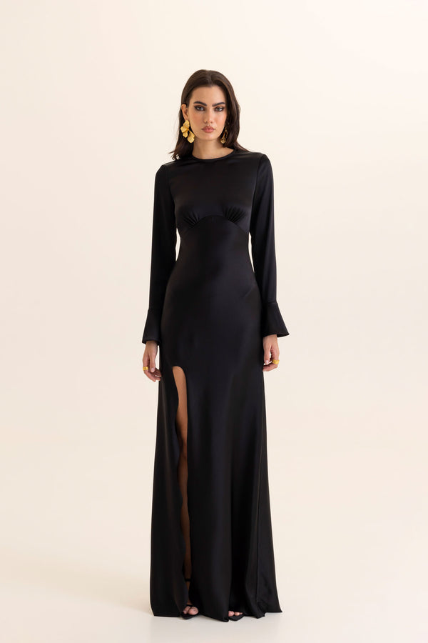 A midnight secret unveiled — Majestic Swan is a floor-length gown that balances composure with allure. Cut from fluid satin, it glides along the body with quiet intensity, the long sleeves finishing in flared cuffs that echo subtle drama. The high neckline speaks of restraint, while the daring front slit breaks the silence, revealing movement and fire beneath. A study in contrasts — mystery, power, and grace woven into one.