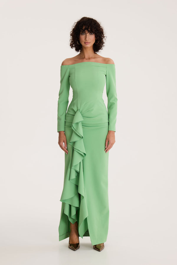 A silhouette that breathes in soft elegance — Matcha Passion is a floor-length gown crafted in luminous mint crepe, its off-shoulder neckline revealing the collarbones with quiet, confident grace. The long sleeves sculpt the arms, while a sculptural ruffle unfurls down the front, creating a vertical line that flows like a vine in motion. Serene yet striking, this is a gown that speaks in curves, gestures, and subtle drama.