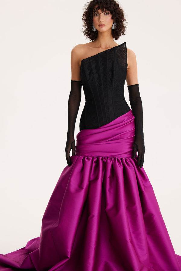 A cinematic homage to timeless glamour, Midnight Orchid is sculpted with a structured black lace bodice that contours the silhouette with quiet confidence. The asymmetric neckline adds a modern edge, while the vibrant fuchsia skirt unfurls in luminous folds, crafted from rich taffeta that catches the light with every movement. Ruched draping at the hip melts into a voluminous, gathered hemline—striking, feminine, and undeniably dramatic.