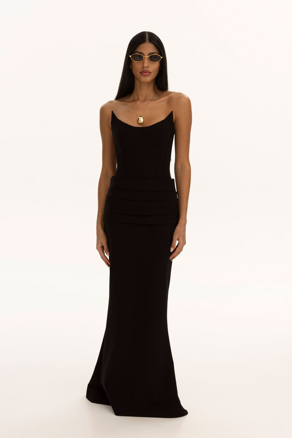 A study in sculptural allure — Noir Seduction is a gown that redefines timeless elegance through bold architecture and fluid grace. The sharp sweetheart neckline rises with quiet drama, while a structured corset bodice carves a striking hourglass silhouette. Layered waistband detailing refines the waist with precision, before releasing into a full-length skirt that drapes in uninterrupted flow. Commanding yet refined, this is the gown that leaves an indelible impression.