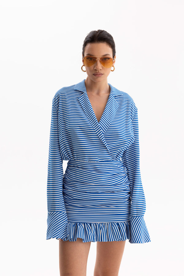 A silhouette that laughs with the sea breeze — Ocean Stripes is a striped mini dress cut in crisp jersey, playful yet precise. The deep wrap neckline hints at effortless ease, while the ruched waist sculpts the body in fluid motion. Flared cuffs and a ruffled hemline bring a sense of movement, as if the dress itself were caught in the tide. This is the piece that doesn’t wait for summer — it creates it.