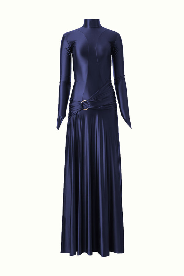 A silhouette that moves like the tide — Ocean Whisper is a gown of quiet strength and flowing grace. Cut from lustrous navy jersey, it sculpts the body with sleek precision before gathering at the waist into a polished metal ring, a detail that catches the light like water in motion. The high neckline and long sleeves add refinement, while the skirt cascades to the floor in liquid folds, evoking the rhythm of the sea.