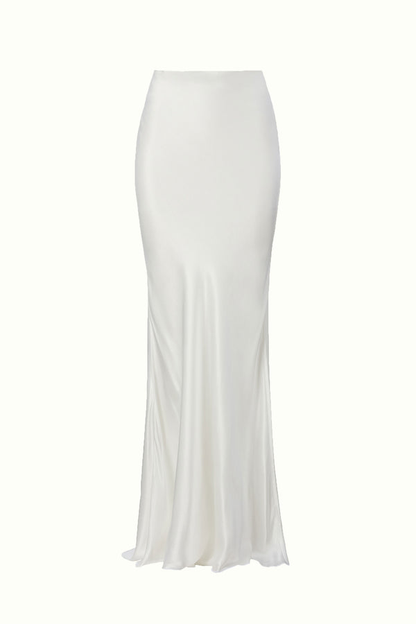 Sleek and sensual, this low-waisted satin skirt is cut on the bias for a beautifully fluid drape that skims the body and flares subtly at the hem. Crafted from a lustrous pearl white fabric, it highlights the hips and elongates the silhouette with every movement. The dropped waistline adds a bold, contemporary edge—perfect for pairing with corsets or cropped tops for an effortlessly striking look.
