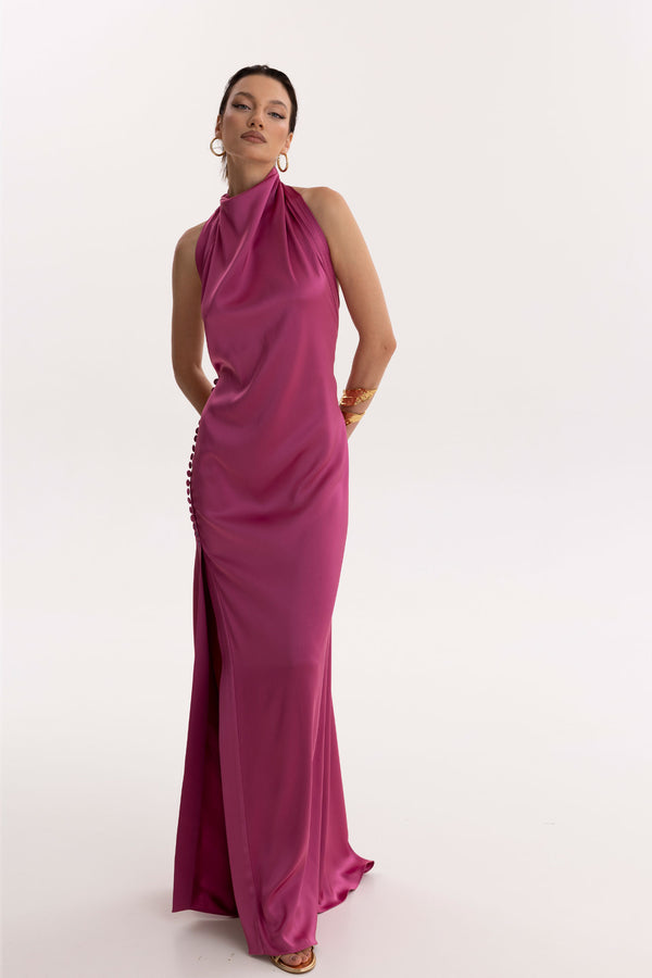 A vision of modern sensuality — Pink Allure is a gown that embodies both confidence and grace. The halter neckline gathers softly at the collarbones before falling into an open back, a daring contrast that reveals with precision. Draped satin flows fluidly over the body, its side slit lending ease to the silhouette, while a trail of buttons at the hip adds a touch of couture detail. Bold yet delicate, it is allure distilled into movement.