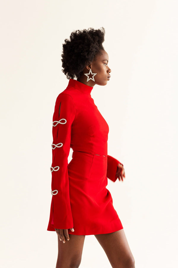 This red mini dress crafted from tricacetato gracefully hugs the body’s natural curves. The dazzling details on the sleeves create the perfect balance between classy and fun. Wear it with some slingback heels and be sure to steal the spotlight.