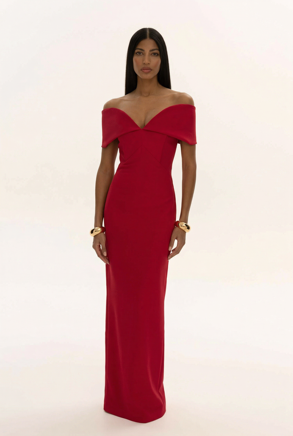 A silhouette that speaks in bold sonnets of fire — Red Muse is a floor-length gown sculpted in saturated scarlet. The off-shoulder neckline frames the collarbones like architecture, folding into a deep V that commands without asking. Clean lines elongate the figure, while the structured bodice holds its form with quiet strength. This is the dress that doesn’t just enter a room — it owns it.