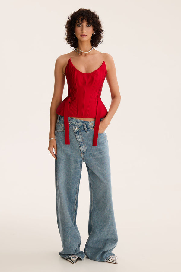 A study in bold femininity, Red Rabbit is sculpted from lustrous crimson satin that catches the light like a quiet flame. The structured bodice smooths and shapes with precision, while the curved neckline creates a lifted, romantic silhouette. Two elongated ties fall gracefully from the waist, adding a touch of undone allure. Paired with relaxed denim, it becomes the perfect balance of softness and edge.