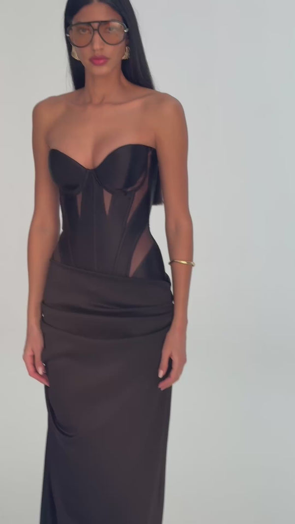 A silhouette that sculpts like armor yet breathes like silk — Shadow Dress is a floor-length gown with a corseted bodice, sheer panels, and draped jersey that wraps the hips with deliberate grace. The strapless neckline bares the shoulders in defiant elegance, while the boned construction carves a form both fierce and feminine. Structured and sensual, this is the dress that doesn’t just exist in the night — it defines it.