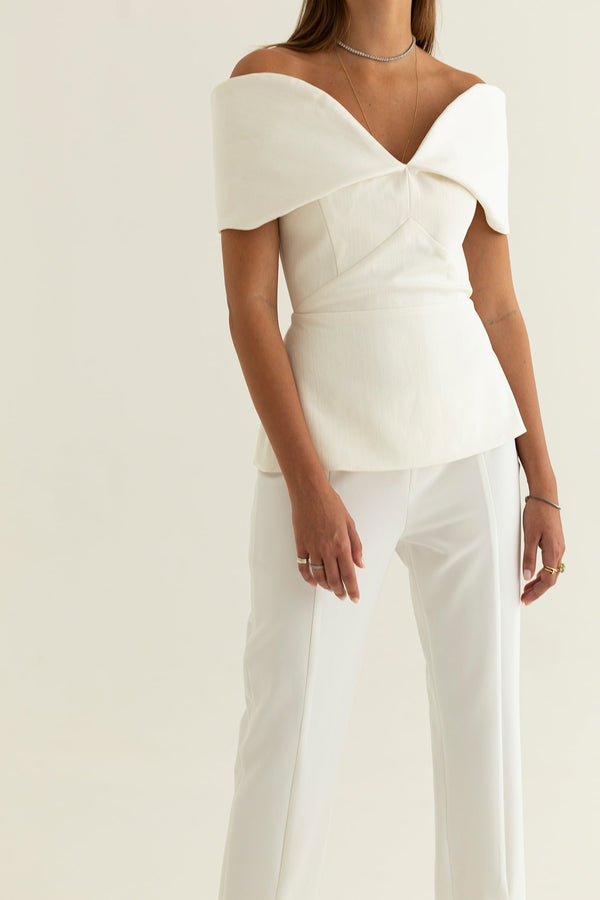 A breath captured in form — Heart-Shaped Top is a top that sculpts purity into elegance. Cut in pristine white, its off-shoulder neckline unfolds like a bloom at dawn, framing the collarbones with architectural softness. The bodice fits with quiet precision before flaring into a subtle peplum — structured yet fluid, timeless yet modern. It is a piece that embodies both lightness and strength.
