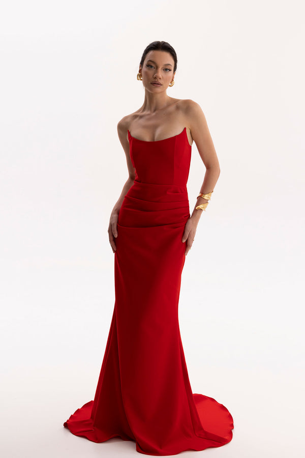 A vision etched in fire and finesse — The Red Queen is a statuesque gown designed for magnetic presence. Crafted from sculpting crepe, it caresses the silhouette with architectural precision: a gently curved neckline, a cinched waist wrapped in asymmetrical draping, and a skirt that pools into an elegant train. Every seam is intentional, every line a quiet provocation. This is not just a red dress — it’s a red moment.