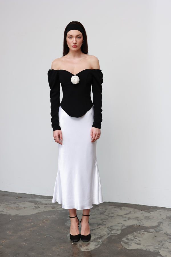 A dark bloom under dimmed lights — Touch Of Drama Top is a sculpted off-shoulder corset kissed with a single white rose at its heart. The sharp neckline and draped sleeves frame the body with elegance, while the contrast flower whispers romance in the language of noir.
