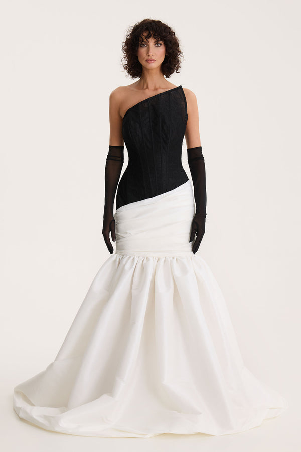 A monochrome reverie in sculpted elegance, White Eclipse pairs a structured black lace bodice with a sweeping white taffeta skirt for a look that feels both timeless and boldly modern. The asymmetric neckline frames the shoulders with quiet drama, while the ruched waist wraps the figure in soft, fluid lines. Below, the voluminous gathered hemline blooms into a luminous cascade—striking, romantic, and effortlessly grand.